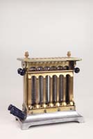 Grille-pain électrique de forme rectangulaire en laiton reposant sur un socle en aluminium. Les grilles s’ouvrent par des boules en céramique émaillée bleue.