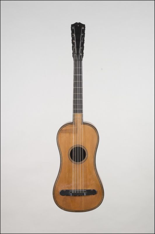 Guitare. Table en 2 pièces épicéa à pores réguliers, fond en 2 pièces en érable ondé, éclisses en érable ondé. Fond chevillé en haut et en bas avec chevilles en os et ivoire. Sillet en ébène non d’origine. Touche, ébène, manche en bois noirci, 6 frettes en os ou ivoire, 4 frettes changées. 10 chevilles boudin ébène. Chevillier en érable plaqué d’ébène, décor d’entrelacs sur le bord de la table en érable et ébène. Le fond est bordé de bois noirci. Vernis jaune clair. Table non vernie,10 cordes doubles : 6 en nylon et 4 en métal. Guitare très élégante.
