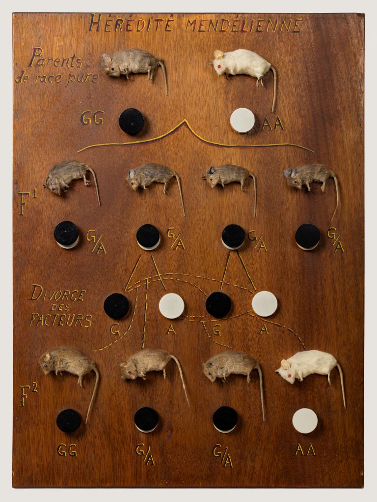 Hérédité mendélienne - Souris naturalisées sur panneau de bois peint -Crédit photo Michel Bourguet