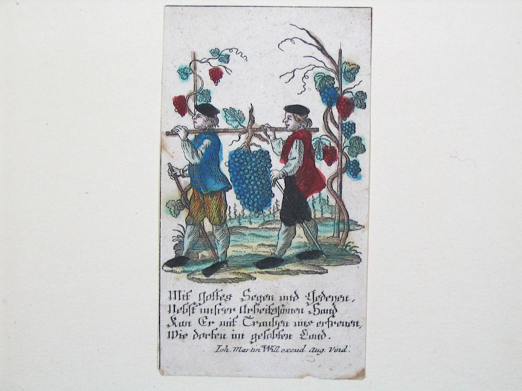 Deux hommes transportant une grappe de raisin, ceps de vigne, couleur dominante bleu, texte imprimé en dessous.