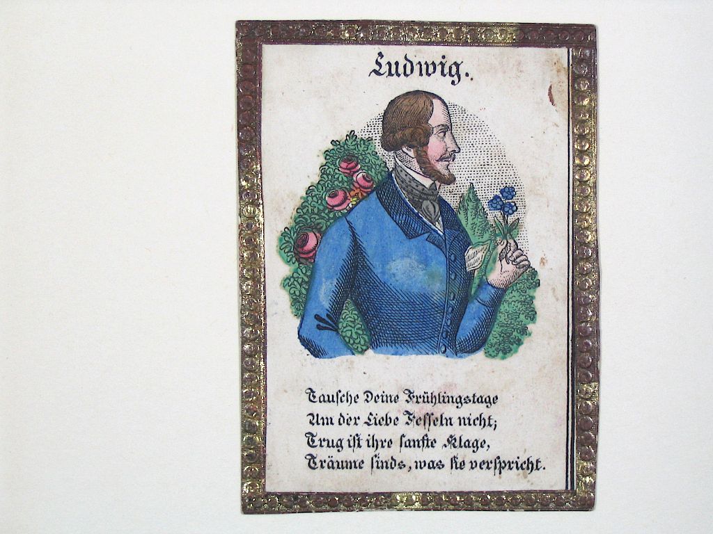 Titre inscrit: Ludwig, personnage avec une fleur à la main avec texte imprimé en dessous.