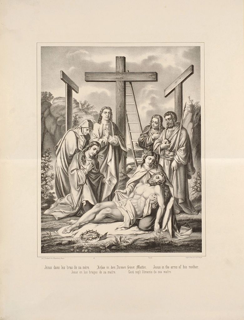 Titre : Jésus dans les bras de sa mère. (titre inscrit, français, allemand, anglais, espagnol, portugais)