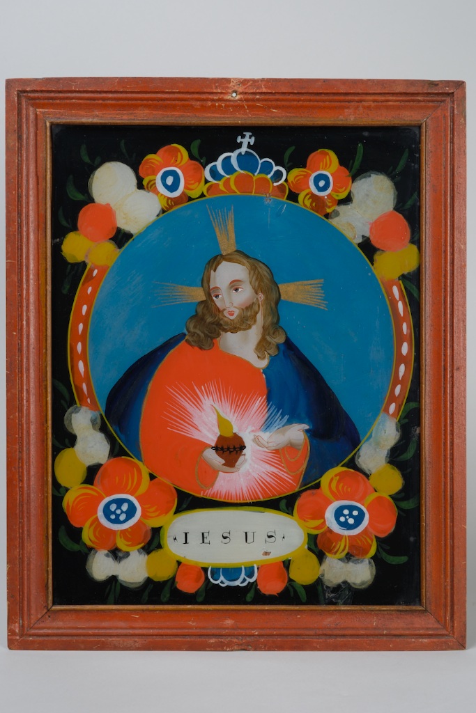 Cadre d’époque en sapin mouluré peint en rouge. Accrochées bien en évidence aux murs lambrissés des « Stube » des fermes ou plus discrètement dans les alcôves et les chambres, les peintures sous verre ont égayé la vie quotidienne des familles paysannes. De 1780 à 1850, ces tableaux aux couleurs restées si vives grâce à la protection du verre, ont été presque la seule imagerie populaire du monde rural. Les thèmes illustrés étaient essentiellement religieux: pour les catholiques, la Vierge et les saints, pour les protestants, les scènes du cycle de Pâques (Cène, Crucifixion). Apparus plus tard, les sujets profanes connurent aussi un certain succès: allégories de saisons (ou de pays) et hommes célèbres remplacèrent les saints ou vinrent s’y ajouter. Le fonds de peintures sous verre du Musée Alsacien fut réuni pour l’essentiel au début du siècle par les fondateurs du musée. Par la suite, plusieurs collections particulières quittèrent l’Alsace pour enrichir des musées à Epinal, Bâle, Luxembourg et Paris. Les conservateurs successifs du Musée Alsacien cherchèrent par conséquent toutes les occasions de compléter le fonds par l’acquisition des différents thèmes abordés dans la peinture sous verre populaire alsacienne. Huit œuvres purent être acquises par la Ville de Strasbourg lors d’une vente aux enchères organisée à Genève en novembre 1986. La collection ainsi dispersée était celle de Théodore Delachaux, ancien Conservateur du Musée d’Ethnographie de Neuchâtel (Suisse). Il avait acquis une trentaine de peintures sous verre apportées autrefois en Suisse par les colporteurs qui les diffusaient depuis les centres de fabrication situés en Bavière, en Forêt­ Noire ou encore en Alsace. Il est souvent difficile de distinguer les peintures sous verre d’Alsace de celles de l’autre rive du Rhin, ce qui s’explique aisément lorsque l’on sait que la plupart des peintres sous verre connus en Alsace étaient venus de Forêt-Noire. Les acquisitions faites en 1986 ont enrichi le Musée Alsacien de plusieurs œuvres de qualité illustrant des thèmes qui n’étaient pas encore représentés dans son fonds de peintures sous verre.