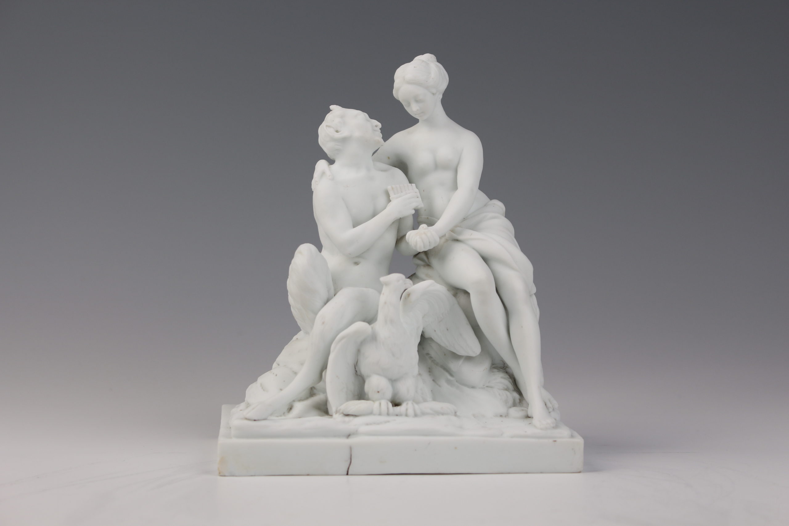 Ce groupe en biscuit de porcelaine représente Jupiter sous les traits d’un satyre et la nymphe Antiope. Un aigle au-devant suggère qu’il s’agit bien de Jupiter. Antiope le bras autour des épaules de Jupiter, l’autre main dans celle de Jupiter, le surplombe les yeux dans les yeux. La marque NIDERVILLE est présente en relief dans un cartouche avec le N inversé.