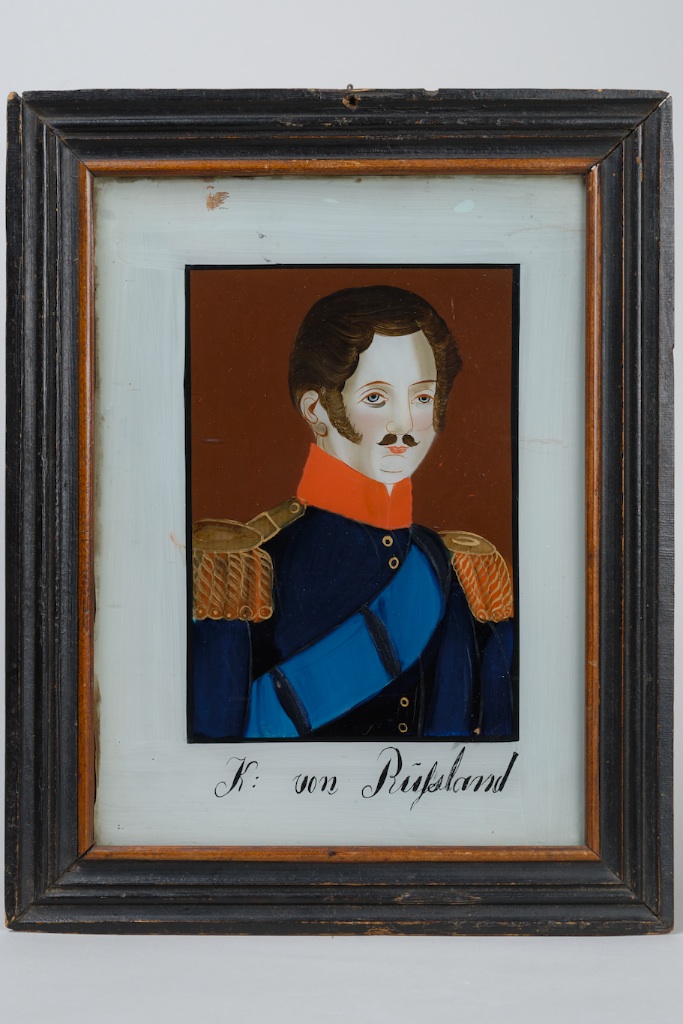 Cadre d’époque en sapin mouluré partiellement peint en noir. Accrochées bien en évidence aux murs lambrissés des « Stube » des fermes ou plus discrètement dans les alcôves et les chambres, les peintures sous verre ont égayé la vie quotidienne des familles paysannes. De 1780 à 1850, ces tableaux aux couleurs restées si vives grâce à la protection du verre, ont été presque la seule imagerie populaire du monde rural. Les thèmes illustrés étaient essentiellement religieux: pour les catholiques, la Vierge et les saints, pour les protestants, les scènes du cycle de Pâques (Cène, Crucifixion). Apparus plus tard, les sujets profanes connurent aussi un certain succès: allégories de saisons (ou de pays) et hommes célèbres remplacèrent les saints ou vinrent s’y ajouter. Le fonds de peintures sous verre du Musée Alsacien fut réuni pour l’essentiel au début du siècle par les fondateurs du Musée. Par la suite, plusieurs collections particulières quittèrent l’Alsace pour enrichir des musées à Epinal, Bâle, Luxembourg et Paris. Les conservateurs successifs du Musée Alsacien cherchèrent par conséquent toutes les occasions de compléter le fonds par l’acquisition des différents thèmes abordés dans la peinture sous verre populaire alsacienne. Huit œuvres purent être acquises par la Ville de Strasbourg lors d’une vente aux enchères organisée à Genève en novembre 1986. La collection ainsi dispersée était celle de Théodore Delachaux, ancien Conservateur du Musée d’Ethnographie de Neuchâtel (Suisse). Il avait acquis une trentaine de peintures sous verre apportées autrefois en Suisse par les colporteurs qui les diffusaient depuis les centres de fabrication situés en Bavière, en Forêt Noire ou encore en Alsace. Il est souvent difficile de distinguer les peintures sous verre d’Alsace de celles de l’autre rive du Rhin, ce qui s’explique aisément lorsque l’on sait que la plupart des peintres sous verre connus en Alsace étaient venus de Forêt-Noire. Les acquisitions faites en 1986 ont enrichi le Musée Alsacien de plusieurs œuvres de qualité illustrant des thèmes qui n’étaient pas encore représentés dans son fonds de peintures sous verre.