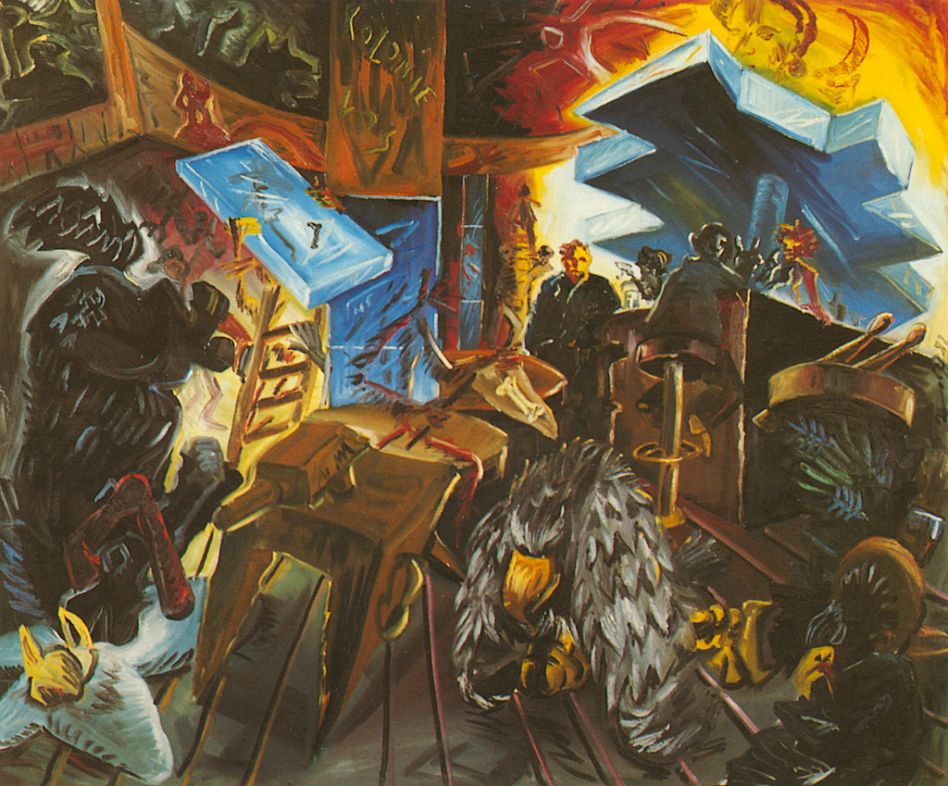 Jorg Immendorf est né en 1945 à Bleckede sur la rive occidentale de l’Elbe, frontière entre les deux Allemagnes jusqu’à leur réunification en 1991. Etudiant à l’Académie des Beaux-Arts de Düsseldorf à partir de 1963, il entre, après trois semestres dans le département de la scénographie, dans la classe de Joseph Beuys avec lequel il entretient des rapports étroits. Engagé politiquement, comme son professeur, il utilise la peinture comme moyen de communication politique et sociale. Sa peinture figurative le rapproche de tout un groupe d’artistes allemands qu’on a qualifiés de néo-expressionnistes ou néo-fauves. Malgré leur ambiguïté, ces termes rendent bien compte de la dynamique nouvelle de l’œuvre d’artistes comme Immendorf, qui redonnent à la peinture ses matériaux, ses mythes, et son pouvoir émotif. « Kolonie-Los » fait partie d’une série de tableaux peints entre 1978 et 1982 qui porte le titre général de « Café-Deutschland ». Sorte de vision personnelle et globalisante de l’Allemagne d’il y a dix ans, on y trouve un concentré de tous les mythes et les angoisses de ce pays et de notre monde moderne. « Kolonie-Los », un des derniers tableaux de la série, est une peinture réaliste caractérisée par une vision critique et un engagement politique, mais il s’y établit entre les objets et les personnages une relation grotesque, déformée et chaotique, qui provoque un effet de distanciation voulu par l’artiste par rapport au contenu de la peinture. Le réalisme d’Immendorf est « sans style »: il s’affirme avant tout comme son propre moyen d’expression et « Kolonie-Los », en dehors de toute référence politique ou artistique, est avant tout la vision individuelle d’un artiste à travers la puissance retrouvée de la peinture.
