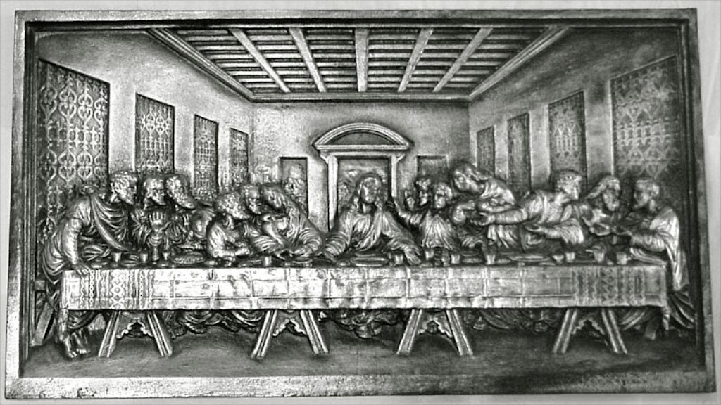 Plaque rectangulaire en fonte moulée présentant en bas-relief la Cène, d’après le tableau de Léonard de Vinci. Dans un décor de salle dont le plafond à caissons et les tentures aux murs révèlent la perspective, sont attablés, de front, les douze apôtres avec le Christ au milieu d’eux, partageant son dernier repas. D’après » La Cène » de Léonard de Vinci. Plaque modèle gravée par Leonhard Posch, coulée pour la première fois en 1823. Modèle repris ultérieurement par plusieurs fonderies.