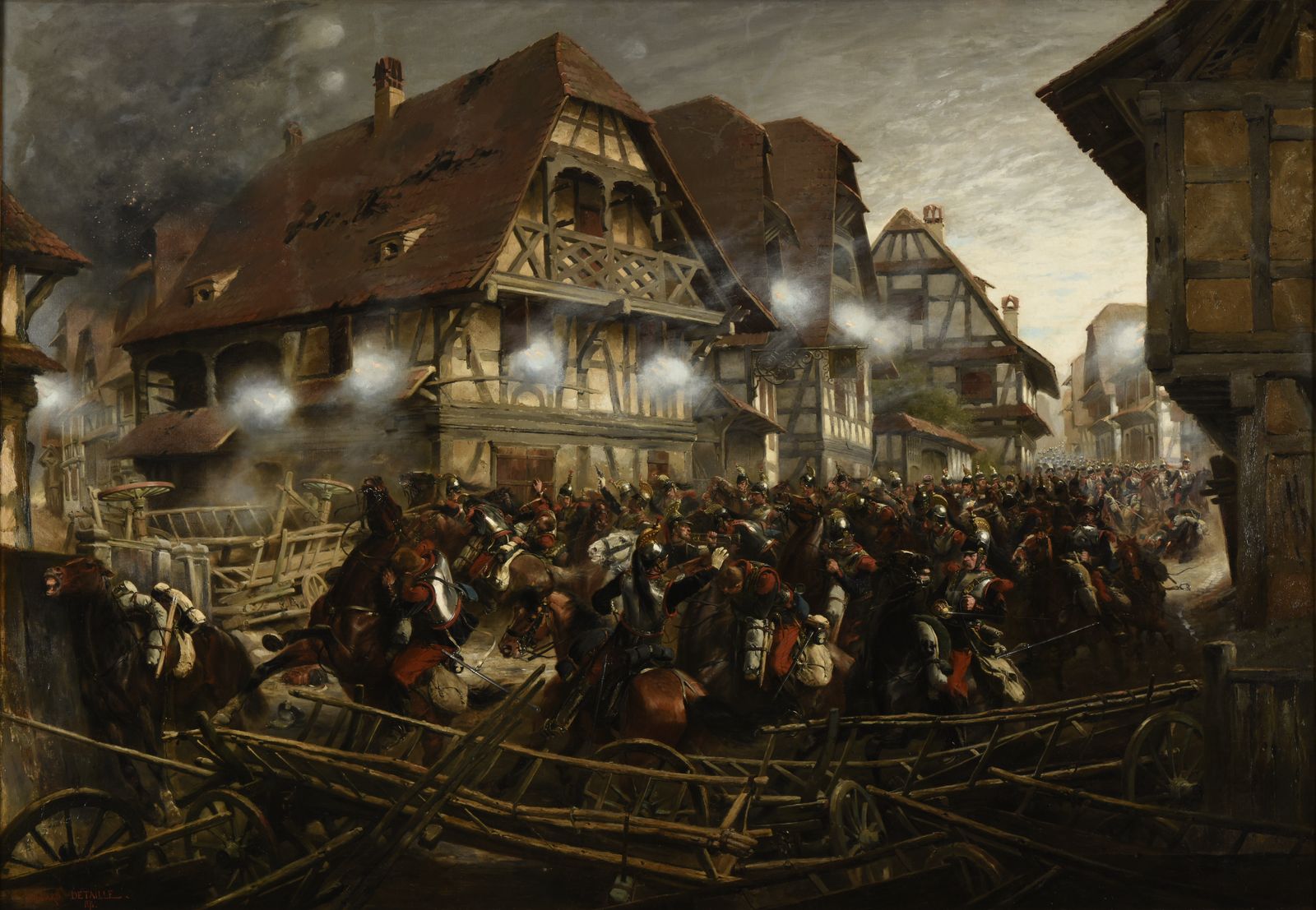 Cette toile, qui fut présentée lors du Salon de 1874, figure le sacrifice du 9e régiment de cuirassiers français, lors de la bataille de Reichshoffen, en 1870. Le 6 août, une charge est lancée contre l’armée prussienne dans les rues étroites de la commune de Morsbronn (Bas-Rhin). La quasi-totalité des cuirassiers, moins nombreux et moins bien armés que l’ennemi, est massacrée. À travers cette œuvre, qui représente pourtant une défaite, Édouard Detaille cherche à exalter l’héroïsme de l’armée française.