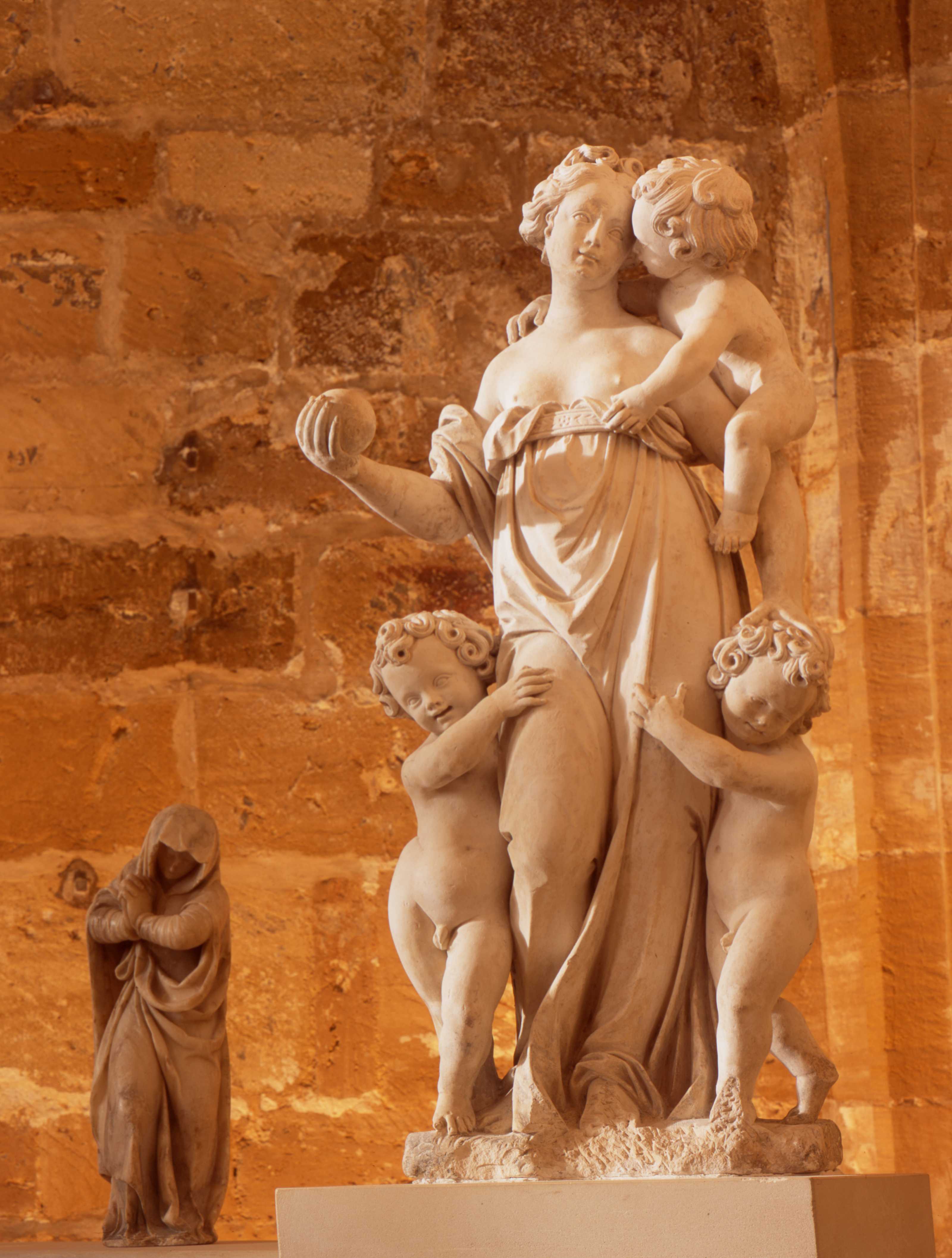 Datée vers 1580, La Charité s’inscrit dans la lignée des œuvres de Ligier Richier, de sa famille ou de son atelier. Elle se distingue par la grande qualité de sa sculpture et le traitement très doux et délicat des figures. Le groupe se compose d’une femme, allégorie de la Charité, l’une des trois vertus théologales, entourée de trois enfants qui s’agrippent à elle avec tendresse et espièglerie. Elle est vêtue d’une robe ceinturée sous la poitrine et laissant cette dernière découverte. Dans sa main droite, elle tient un globe, symbole d’universalité.