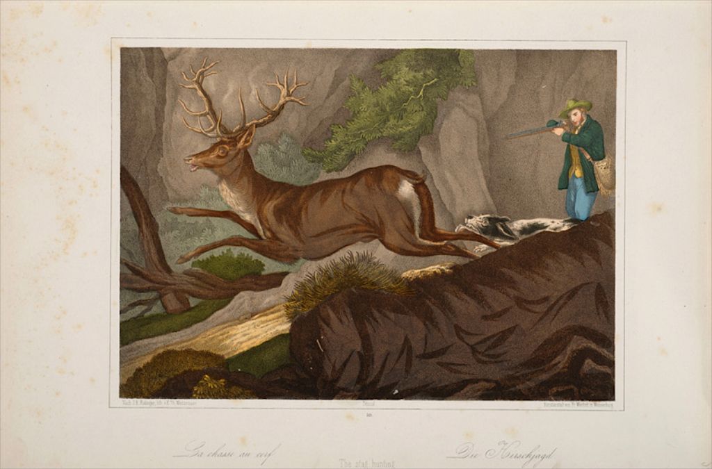 Titre : La chasse au cerf. (titre inscrit, français, allemand, anglais)