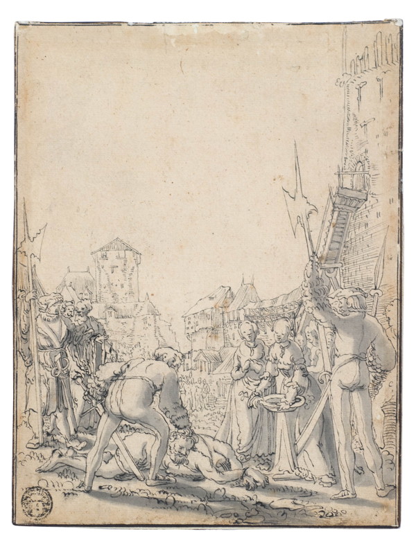 scène biblique (saint Jean Baptiste : Décollation, bourreau, spectateurs, vue de ville)