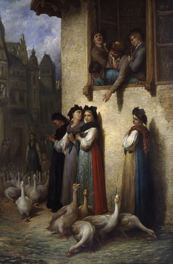 Scène de rue dans un village alsacien. Alsaciennes sous une fenêtre d’où se penchent de jeunes Alsaciens. Au pied des Alsaciennes, troupeau d’oie.