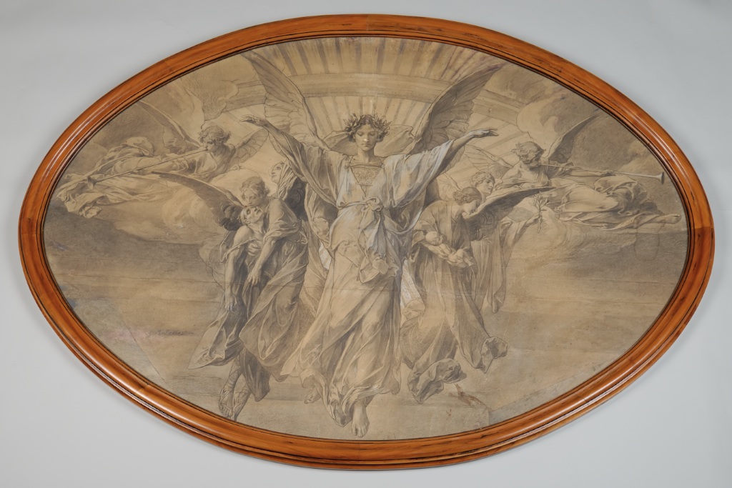 Début de la première guerre mondiale. Esquisse sur papier en vue d’une fresque destinée à la chapelle du cimetière de Pforzheim. La mairie de Barr possède déjà un détail de ce tableau allégorique de la paix, dans lequel un ange soulève le corps d’un homme tué à la guerre.