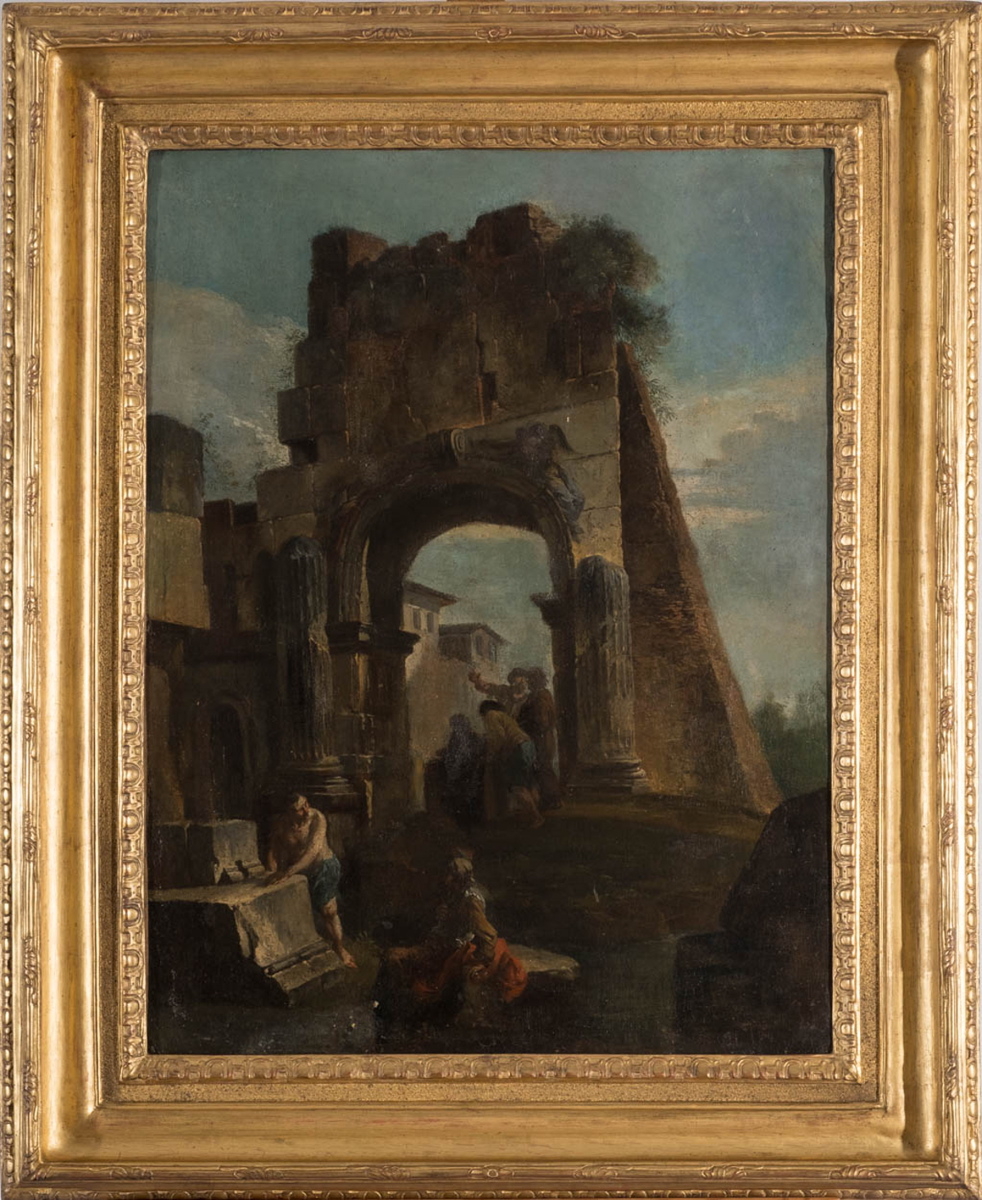 L’œuvre est attribuée au peintre italien Andrea Locatelli, connu pour ses paysages et ses vues architecturales. Cette représentation de l’Arc de triomphe de Titus à Rome serait assez fidèle à son aspect du XVIIIe siècle, quoique sous-dimensionnée. Mais davantage qu’une représentation réaliste, il s’agit d’une évocation du monument et des valeurs qu’on lui associe. Cette iconographie illustre en effet le goût du XVIIIe siècle pour les paysages de ruines. Les artistes présents à Rome reproduisent et assemblent les ruines antiques dans des « caprices » et des vedute (vues, dans le sens de paysages) plus ou moins fantaisistes, animés de personnages. Les collectionneurs apprécient beaucoup ces vues pittoresques et la ruine devient objet esthétique. Mais comme l’écrit alors Diderot, les ruines inspirent aussi à l’homme une méditation, à la fois sur la grandeur des créations humaines et leur vanité, proposant un parallèle entre la déchéance des monuments et la rapidité avec laquelle la vie humaine se délite.