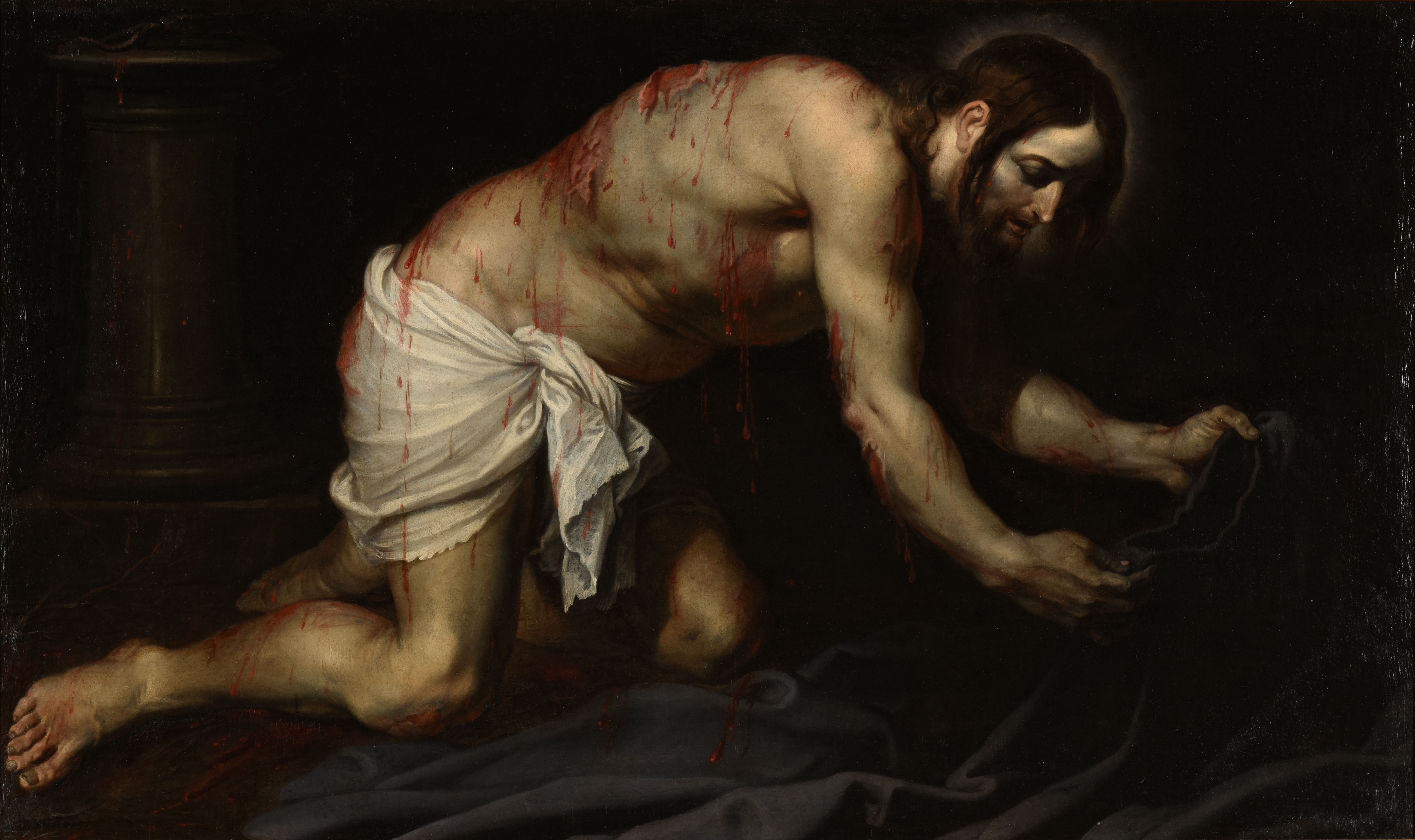 Le dos meurtri, couvert du sang des blessures données par ses bourreaux, le Christ, agenouillé, tente de se saisir du drapé afin de s’en vêtir. La colonne souillée rappelle son supplice Rarement représenté, cet épisode, situé dans le cycle de la Passion, entre la Flagellation et le Couronnement d’épines, permet à l’artiste de livrer une image d’humilité, d’une très grande force expressive, accentuée par le ténébrisme et le cadrage resserré qui monumentalisent le sujet.