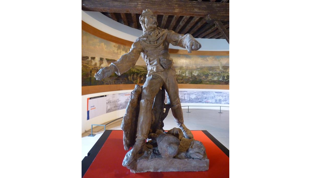 Pour cette esquisse (plâtre avec un enduit brun), Auguste Rodin représente le général debout, jambes écartées le corps appuyé sur sa jambe droite, tenant son sabre (manquant aujourd’hui) dans sa main droite et semblant être prêt à s’élancer à l’attaque. La situation est très réaliste, canon et casque à ses pieds marquent la gravité du monument. On reconnaît le travail de l’artiste rapide et efficace, notamment dans la tête, avec ses grosses moustaches, ses cheveux bouclés au dessus d’un visage torturé à la bouche ouverte.