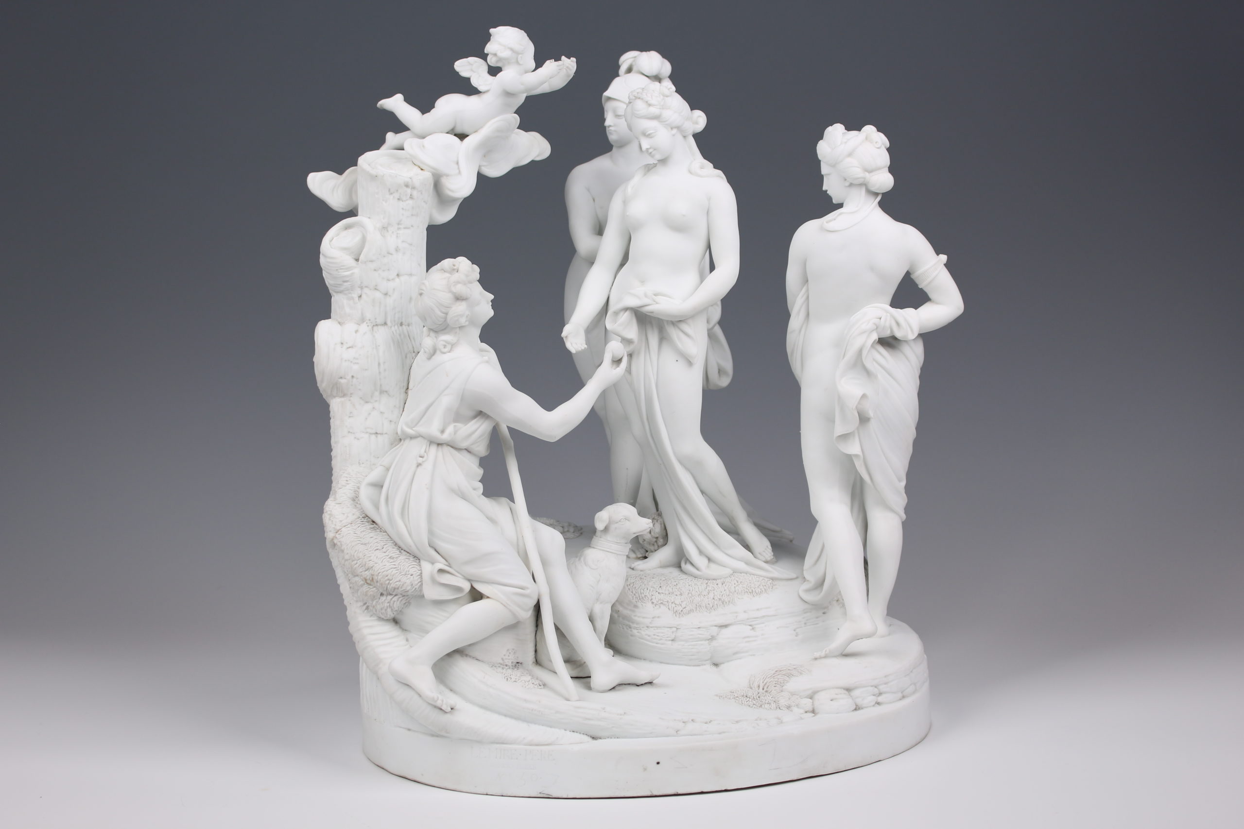 Ce groupe est exceptionnel et particulièrement ambitieux dans la production de Niderviller. Sa composition est organisée autour de quatre personnages que survole un amour. Pâris est assis, avec à ses pieds son chien et tend la pomme d’or à Vénus que l’amour vient couronner. Junon et Athéna entourent Vénus. Elément récurrent dans les compositions de Lemire, la souche vient ponctuer la base rocheuse de la composition tout en lui donnant un dynamisme certain par l’effet d’enroulement sur lequel prend appui le pied de Pâris.