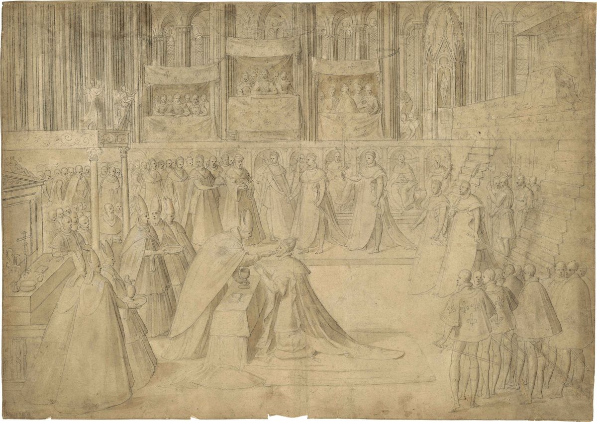 Ce dessin préparatoire constitue un témoignage exceptionnel et unique du sacre d’Henri III à l’intérieur de la cathédrale de Reims le 13 février 1575, et figure notamment de façon inédite les tribunes réservées aux dames de la cour lors de la cérémonie. Il révèle par ailleurs l’influence du maniérisme italien dans l’œuvre d’Antoine Caron, qui travailla à Fontainebleau sous la direction du Primatice aux alentours de 1560, et en particulier dans l’atelier de Niccolò dell’Abbate.