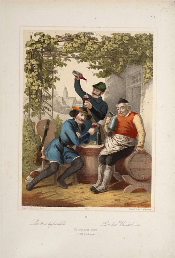 Titre : Les trois hydrophobes. (titre inscrit, français, allemand, anglais)