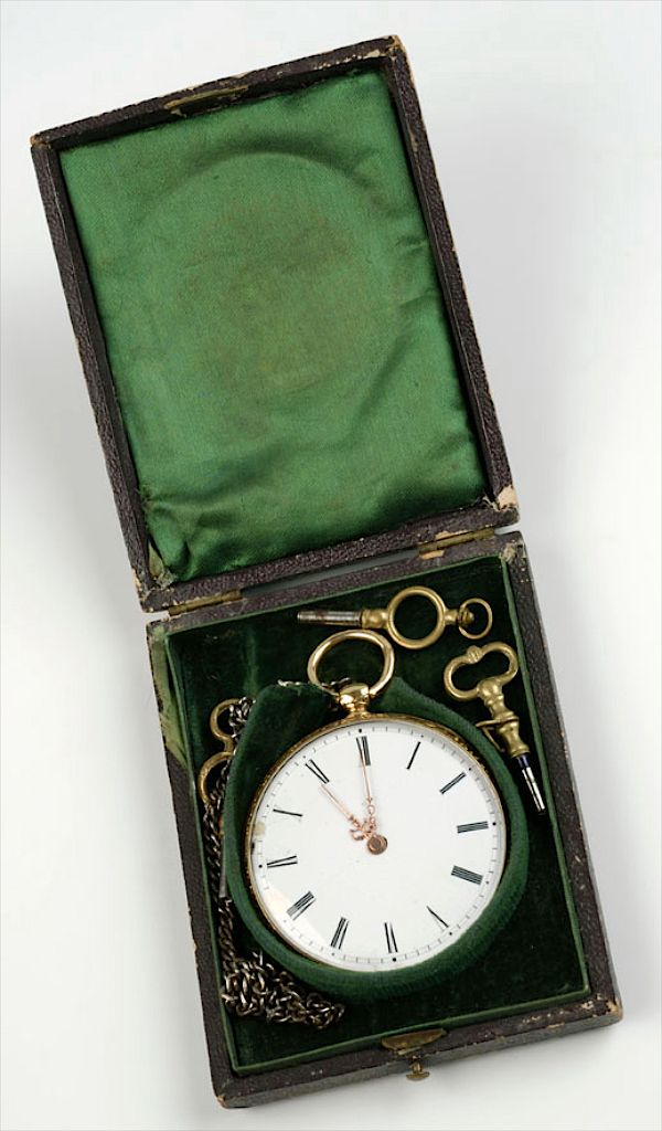 Montre en or ciselé avec cadran en chiffres romains, deux fines aiguilles tréflées en cuivre, un anneau de suspension, s’ouvre devant comme derrière avec, à l’intérieur de la porte arrière, une inscription gravée à la main levée , le fond intérieur porte des inscriptions techniques et deux mécanismes à remonter avec une clé, deux charnières , rangée dans une petite boîte rectangulaire en carton recouvert de papier brun foncé gaufré à couvercle bombé orné d’une frise de rinceaux dorés estampée en creux et doublé à l’intérieur de velours et de soie verts.