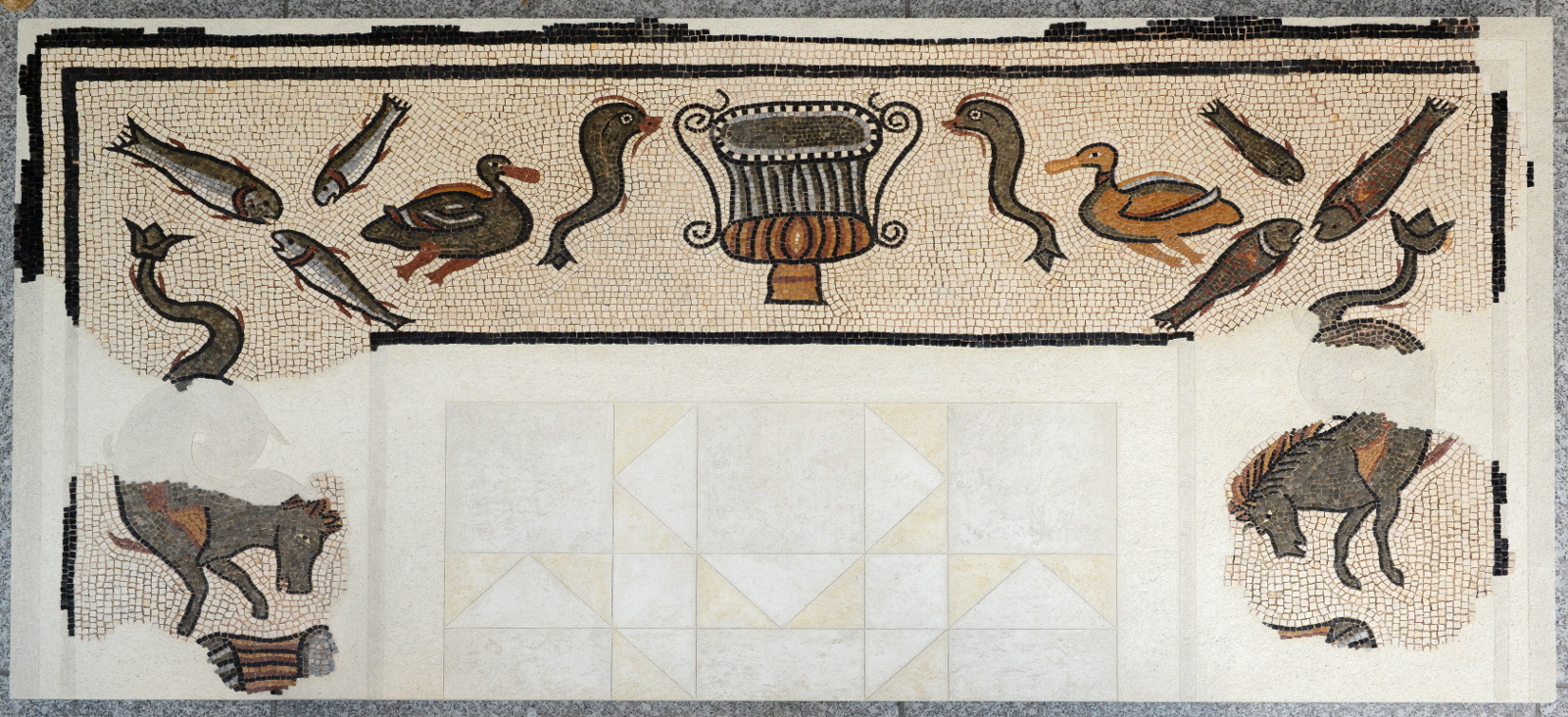 Cette mosaïque s’organisait à l’origine autour de quatre canthares (vases à anses) dont seul un exemplaire est conservé. Des dauphins et des monstres marins ou des hippocampes les encadraient. Enfin, des canards et des poissons étaient placés dans les angles. Cette mosaïque se développait à l’origine autour d’un motif central constitué notamment de plaques de marbre géométriques (opus sectile).