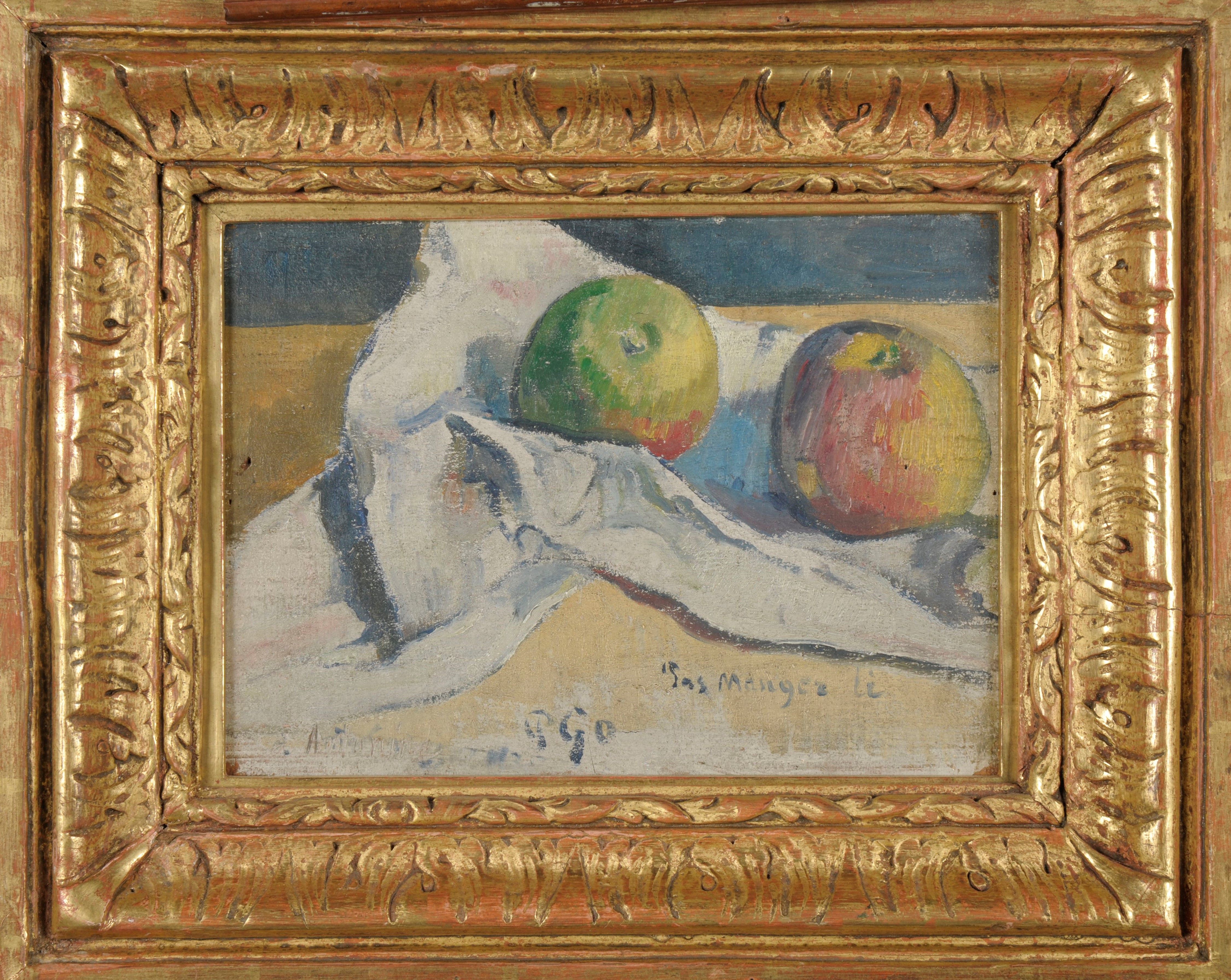 Dans cette composition assez classique qui se joue des couleurs complémentaires, Paul Gauguin se souvient-il de Paul Cézanne qu’il admirait tant ? Malgré l’inscription au dos du tableau « Au bord de l’Océan, avril 1894, en route pour Tahiti », cette nature morte doit plutôt être datée d’avril 1895, moment où l’artiste repart réellement pour le Pacifique. Elle représente sans doute des fruits exotiques vénéneux qui ressemblent à la pomme.