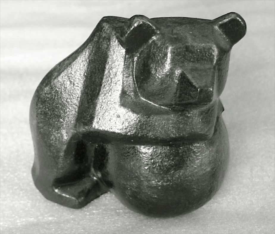 Figurine représentant un ours debout sur ses pattes postérieures et appuyant ses pattes antérieures sur un globe. Les formes sont anguleuses. Sous la figurine est collé un morceau de plastique pour éviter de ne pas rayer ce sur quoi on la pose. Conçue pour servir de presse-papier.