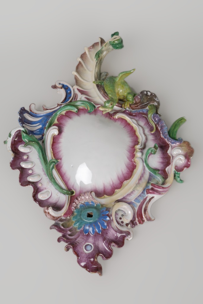 Cette paire d’appliques rocaille représente les deux seuls exemplaires jusqu’à présent connus de ce modèle, sans doute inspiré par des objets exécutés en métal (argent, étain) servant au même usage et qui étaient pourvus d’un petit porte-chandelle, disparu ici, mais dont le système d’accrochage subsiste. Ces deux pièces aux coloris intenses sont tributaires de la verve rocaille strasbourgeoise, volontiers asymétrique, où se mêlent aux bandes coquillées des éléments fantastiques tels que les ailes de chauve-souris et les dragons ailés.