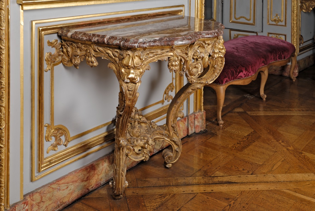 Selon l’usage du 18e siècle, qui fut généralement adopté dans toutes les pièces des Grands Appartements du Palais Rohan, à l’exception de la salle du Synode, les trumeaux d’entre-fenêtres étaient pourvus chacun d’une console en bois doré à « table » de marbre destinée à supporter une girandole. Les trois inventaires du mobilier des Cardinaux de Rohan, dressés en 1749, 1779 et 1790 dans leur résidence strasbourgeoise, en font foi. Lorsque, sous la Révolution, on enleva les meubles du palais pour les vendre aux enchères, entre 1793 et 1795, les pattes métalliques qui retenaient les consoles laissèrent dans les boiseries des trous que l’on boucha sommairement mais qui sont encore visibles en certains endroits. Appelé à visiter, quelque temps avant sa vente, une propriété d’Alsace, j’ai eu la surprise d’y découvrir une paire de superbes consoles dorées d’un style très particulier, caractérisé par des formes fortement mouvementées et surtout par un répertoire ornemental « rocaille » tellement proche de celui des boiseries des Grands Appartements qu’il eût suffi à lui seul à faire présumer que ces meubles très opulents en provenaient. D’autres éléments transformaient cette présomption en certitude absolue: la présence d’une macle – sigle héraldique en forme de losange tiré des armoiries de la maison des Rohan – à la partie supérieure de chaque pied, celle d’un marbre de brèche violette, précisément indiqué par l’inventaire de 1779 pour les consoles du Salon d’Assemblée, les dimensions, ensuite, parfaitement compatibles avec celles des panneaux du bas-lambris de cette pièce et, enfin, les traces du système de fixation d’origine. Celui-ci était de toute évidence rivé primitivement sur deux traverses de bois passant sous le marbre. Ces traverses avaient disparu, mais les mortaises où se logeaient leurs extrémités en queue d’aronde existaient toujours et il suffisait de prendre la distance entre le milieu de chaque mortaise pour obtenir très exactement l’écartement des trous de fixation de la boiserie. Les propriétaires de ces consoles consentirent à les céder au musée où elles reprirent, après presque deux siècles d’absence, la place pour laquelle elles avaient été créées.