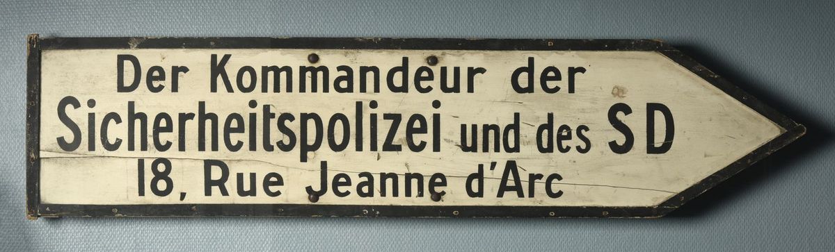 Ce panneau de signalisation allemand indique l’emplacement du siège rémois du commandement du SIPO-SD (Sicherheits polizei und Sicheheits Dienst), équivalent de la Gestapo pour la France, qui était notamment chargé de la lutte contre la Résistance. Il se trouvait à l’angle des rues Buirette et Jeanne d’Arc, à l’emplacement de l’actuel square des Victimes-de-la-Gestapo, et fut enlevé le 30 août 1944, jour de la libération de la ville.