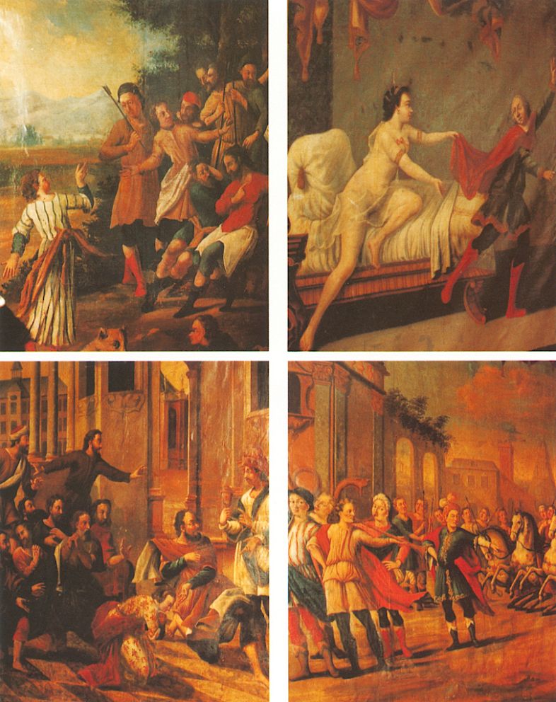 Ces peintures murales proviennent d’une maison bourgeoise située 5 rue des Bouchers à Strasbourg et datée des XVIIème et XVIIIème siècles. Jusqu’à la Révolution, elle semble avoir appartenu à des bouchers, puis elle a successivement abrité au XIXème siècle une brasserie et un estaminet à l’enseigne de l’Aigle. Après la vente de la maison en 1987, les peintures murales qui ornaient une pièces située au premier étage ont été déposées, ainsi que deux dessus de porte, et acquises par le Musée de Saverne grâce à l’aide du FRAM. Par leurs dimensions imposantes, leur thème biblique, la manière dont elles sont agencées sur les murs, elles constituent un exemple unique, sans rapport avec le décor habituel d’une maison bourgeoise au XVIIIème siècle. Sur le plan stylistique, elles évoquent le rococo allemand. Les six panneaux qui les composent sont traités dans un esprit décoratif qui rappelle celui d’une tapisserie. Ces p anneaux relatent l’histoire de Joseph. Fils de Jacob, celui-ci a été vendu par ses frères et conduit en Egypte où il devint ministre du Pharaon et favorisa l’installation des Hébreux dans ce pays. Les différentes scènes de l’histoire de Joseph, telles qu’elles sont placées dans la pièce, ne respectent pas l’ordre chronologique. Il manque un épisode important, celui de l’interprétation des rêves du Pharaon par Joseph. Certains personnages, placés près du bord des panneaux, sont en partie coupés ainsi que la frise décorative qui court le long du sommet des panneaux. Tous ces éléments indiquent que les peintures murales n’ont pas été conçues à l’origine pour la pièce où elles se trouvaient, mais qu’elles constituent un élément rapporté. L’art du XVIIIème siècle étant très mal représenté dans les collections du musée, abrité dans le château des Rohan, cette acquisition permettra de combler en partie cette l acune et d’évoquer un peu les fastes disparus de cet édifice. Panneau nord: entrée triomphale de Joseph, 252×373 cm. Panneau nord-est: Joseph vendu aux marchands ismaélites,252x 155 cm. Panneau mutilé: l’échanson et le jarretier du Pharaon en prison, 127×93 cm. Panneau sud-est: Joseph et la femme de Putiphar, 252×140 cm. Premier demi-panneau sud: Joseph reconnu par ses frères qui se prosternent devant lui, 252×192 cm. Deuxième demi-panneau sud: les frères de Joseph apportant sa tunique ensanglantée, 252×150 cm. Deux dessus de porte entourés d’un cadre de style rocaille, exécutés par un autre artiste.