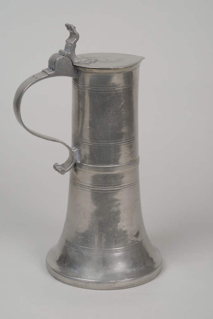 Pichet (dit cannette) de forme tronconique, couvercle plat, levier de couvercle guilloché ainsi que l’extrémité inférieure de l’anse. Sur le couvercle au centre de 4 cercles concentriques, initiales MH séparées par un motif végétal. Sur l’anse, deux ébauches de poinçon illisibles.