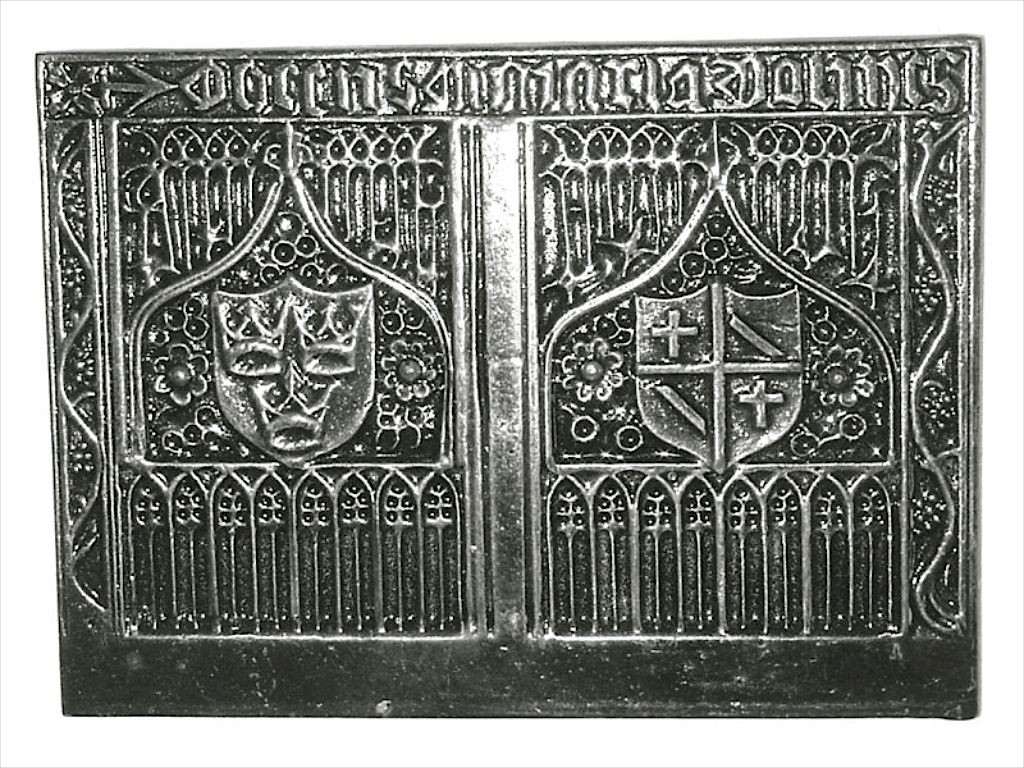Petite plaque rectangulaire en fonte moulée. La plaque présente les deux écussons dans un décor d’architecture gothique. Réalisée à partir d’une taque de cheminée originale coulée dans le Eifel (massif boisé), au XVème siècle. Muni au dos d’un crochet d’attache.