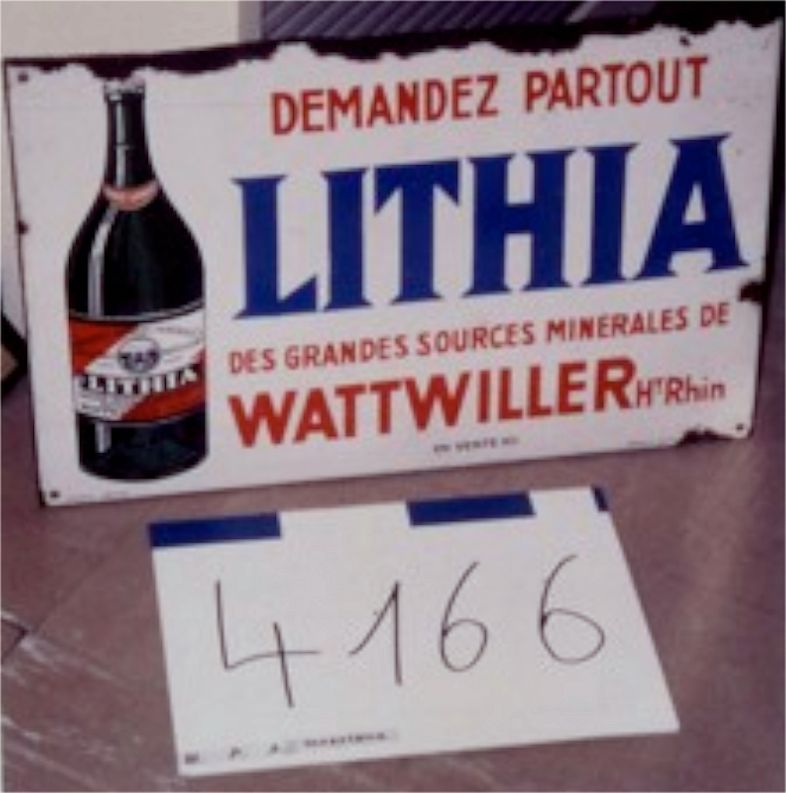 « Demandez partout Lithia des grandes sources minérales de Wattwiller – Ht Rhin», « Lithia ». A partir du XVème siècle, en Alsace, le thermalisme connaît un développement remarquable grâce à la conjonction de deux phénomènes: la prescription médicale et le goût de la noblesse pour les vacances dans les villes d’eau. Soultzbach et Soultzmatt-Geberschwihr étaient les destinations privilégiées des Colmariens pour « prendre les eaux », faire une cure. Après le XVIIIème siècle, le thermalisme alsacien est révolu, sa période de splendeur est passée. Néanmoins les eaux minérales, relookées, embouteillées ou aromatisées, se vendent aujourd’hui très bien et continuent de propager l’image de l’Alsace dans le monde. La station de Wattwiller s’inscrit dans ce cadre général. Cette plaque émaillée acquise en 1991 par l’Ecomusée d’Alsace complète nos collections de plaques publicitaires illustrant tant les pratiques sociales que touristiques de la population alsacienne.