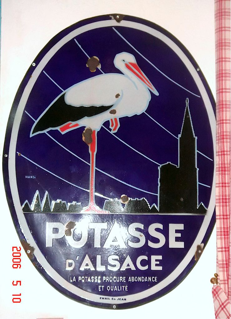 « Hansi ». « Email. Ed. Jean ». « Potasse d’Alsace. La potasse procure abondance et qualité ». En Alsace, la découverte de la potasse en 1904 conduit les sociétés d’exploitation minière à créer une société commerciale destinée à exporter cet engrais dans le monde entier. La SCPA (Société Commerciale des Potasses d’Alsace) est à la recherche d’un symbole fort pour identifier sa marque de sels potassiques. En 1919, le choix se porte sur la cigogne, emblème typiquement alsacien. Véritable logo avant l’ère de la communication, la cigogne marquait tous les points de vente de la potasse sous sa forme d’ovale, ainsi que toute une gamme de supports publicitaires ( sacs, calendriers, parures de tables, cartes postales…). Cette plaque émaillée présente une troisième variante de la cigogne: Hansi, peintre, dessinateur, chantre de l’Alsace française stylise le logo en 1929 afin de rendre l’identité visuelle de la SCPA cohérente, unique et dynamique. La collection de plaques émaillées acquise en 1988 complète les collections d’histoire industrielle de l’Ecomusée d’Alsace, témoigne des transformations de la société alsacienne du XXème siècle et du dialogue entre société rurale et industrielle.