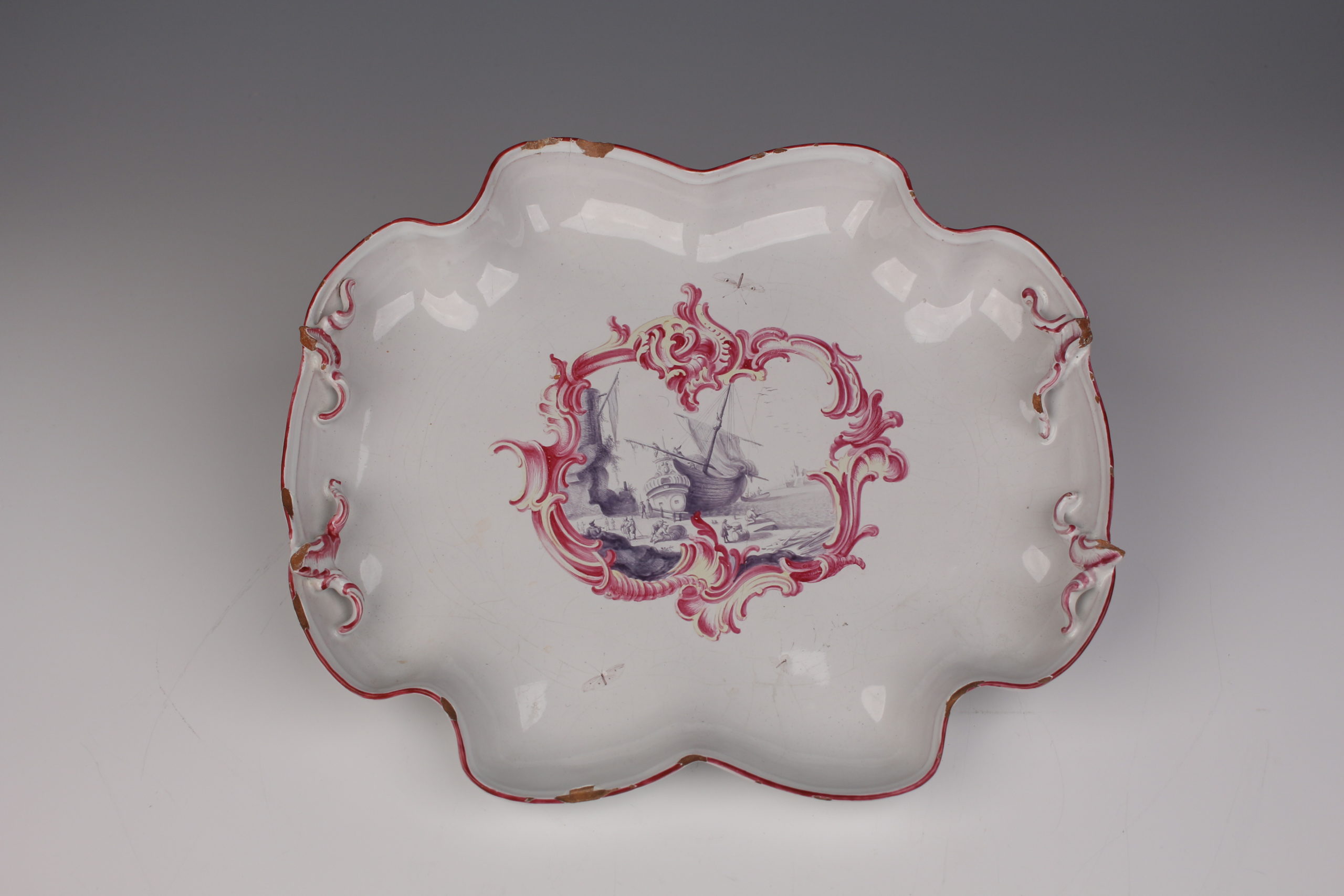 Plateau en faïence de Niderviller à décor de petit feu polychrome de marine en camaïeu gris dans un cartouche rocaille pourpre rehaussé de jaune.