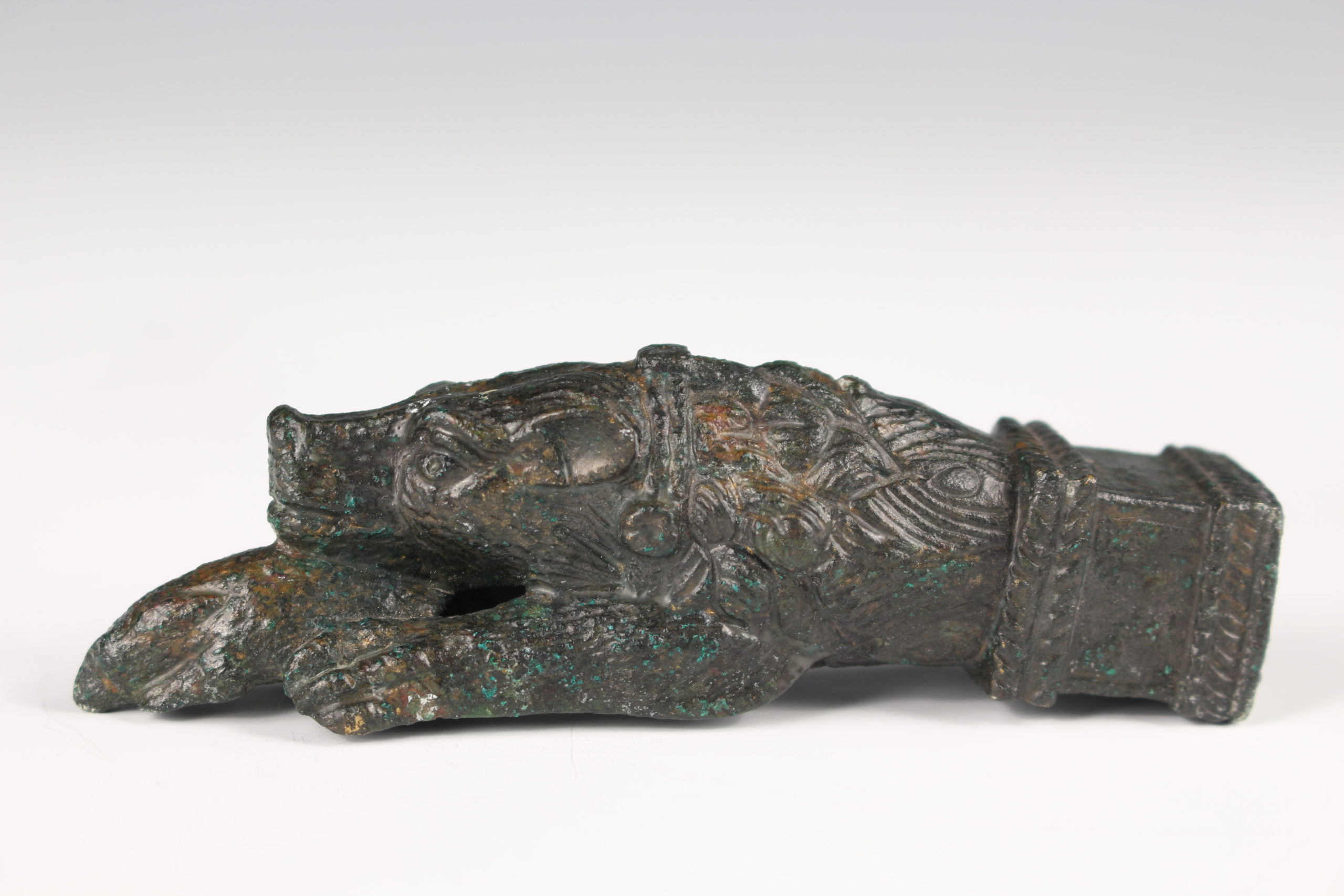 Objet civil domestique trouvé en contexte de fouille sur le site de Berthelming, Altschloss. Le manche semble représenter un chien attrapant un levreau stylisé. Sa longueur indique qu’il pourrait s’agir du manche d’un miroir pour la toilette ou du manche d’un couteau. Toutefois, il est assez épais pour cet usage. Il existe d’autres modèles de ce type dont un manche de miroir trouvé au Hérapel. Des objets similaires ont été trouvé, une poignée de clef avec un lion tenant dans ses pattes un petit animal à Miedelsbach (Musée de Stuttgart) et Abbeville (Musée de Saint-Germain-en-Laye), un manche de couteau représentant une levrette couchée tenant entre ses pattes de devant un lièvre à Eix.