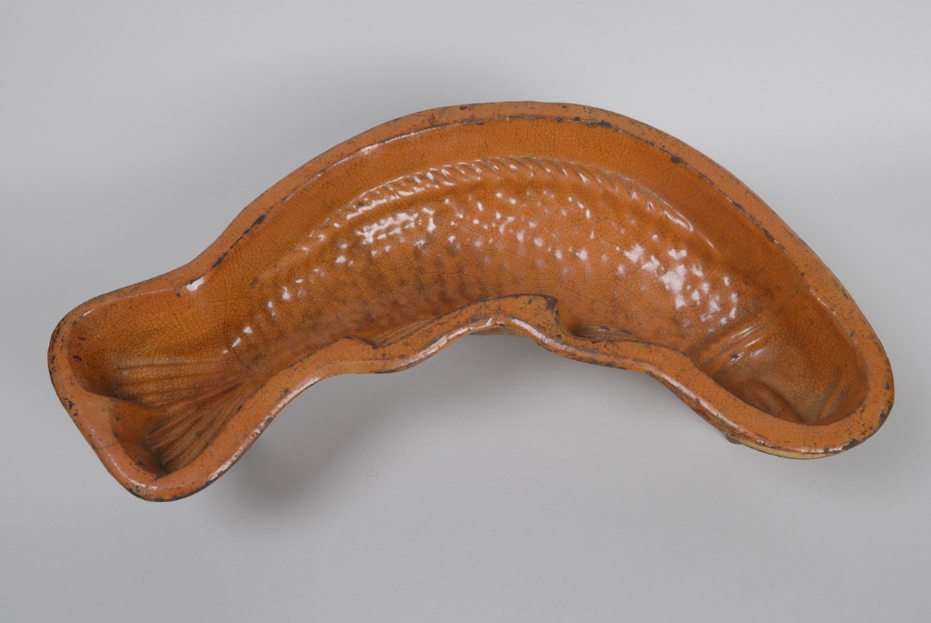 Moule en forme de poisson. Pièce moulée à parois épaisses et décor intérieur en creux et en relief. Intérieur vernissé brun clair.