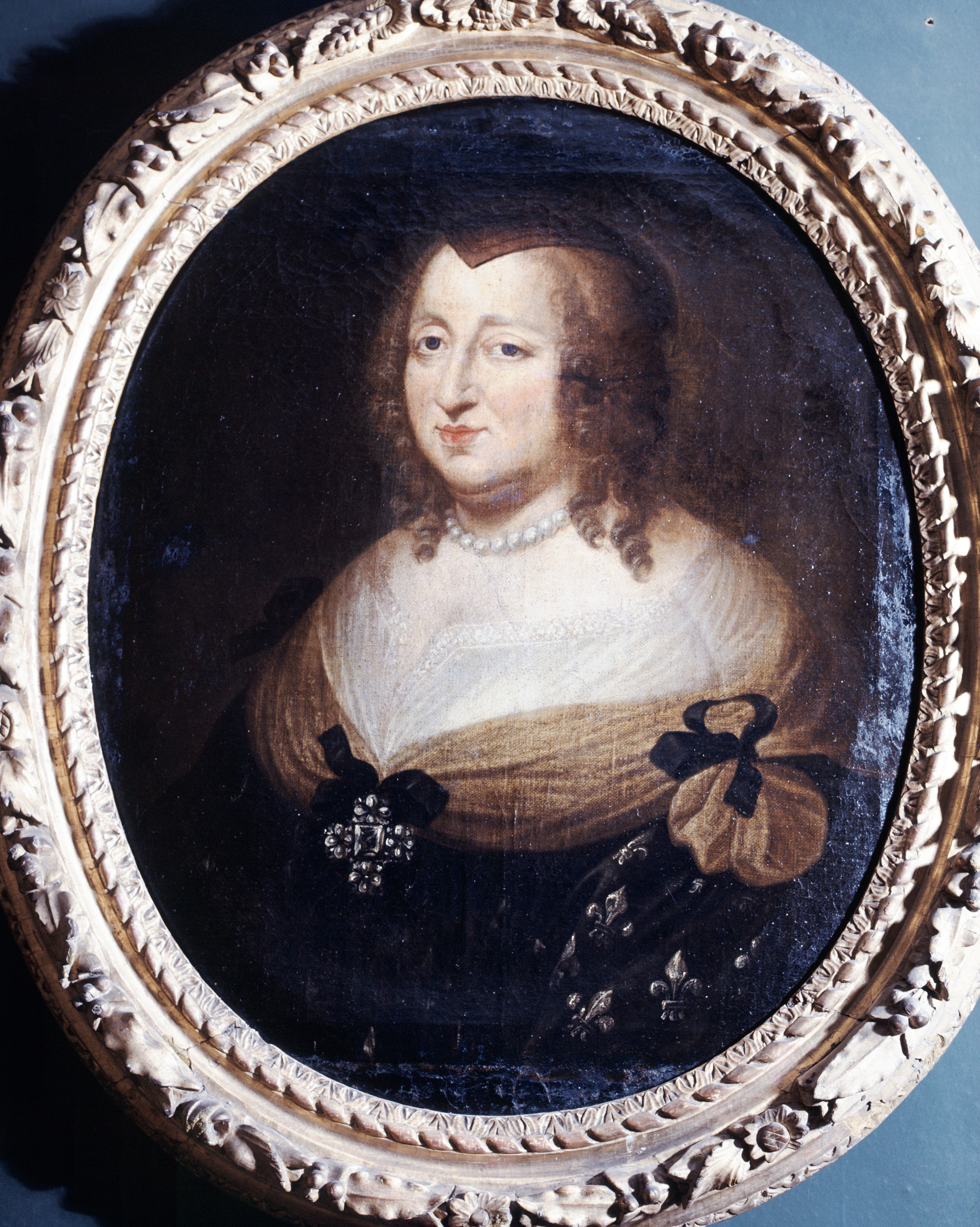 Portrait de femme de trois quart, à mi corps, portant une broche surmontée d’un ruban noir sur la poitrine, un collier. En bas à droite apparaît des fleurs de lys.