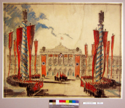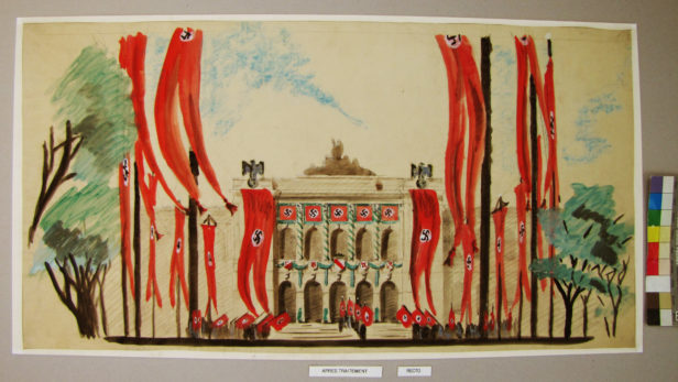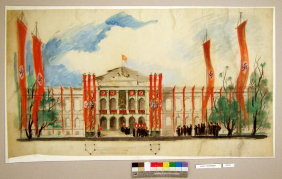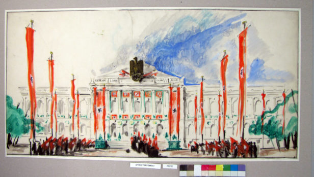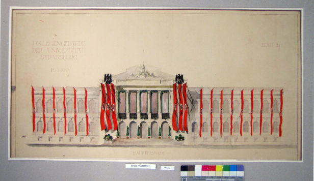 6 dessins sur calque relevés de gouache figurant la façade du palais universitaire de Strasbourg lors de son inauguration par les nazis le 24 novembre 1941 en tant que Reichsuniversität.