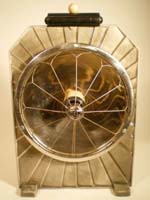 Radiateur électrique en fonte émaillée gris clair surmonté d’une poignée en bois. La résiitance électrique se trouve au centre d’une parabole en acier chromé et est protégée par une grille métallique.