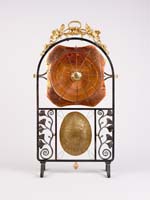 Radiateur électrique parabolique en fer forgé, laiton et cuivre orné de palmettes. La résistance électrique se trouve au centre de la parabole inclinable afin d’orienter la chaleur dans la direction souhaitée.
