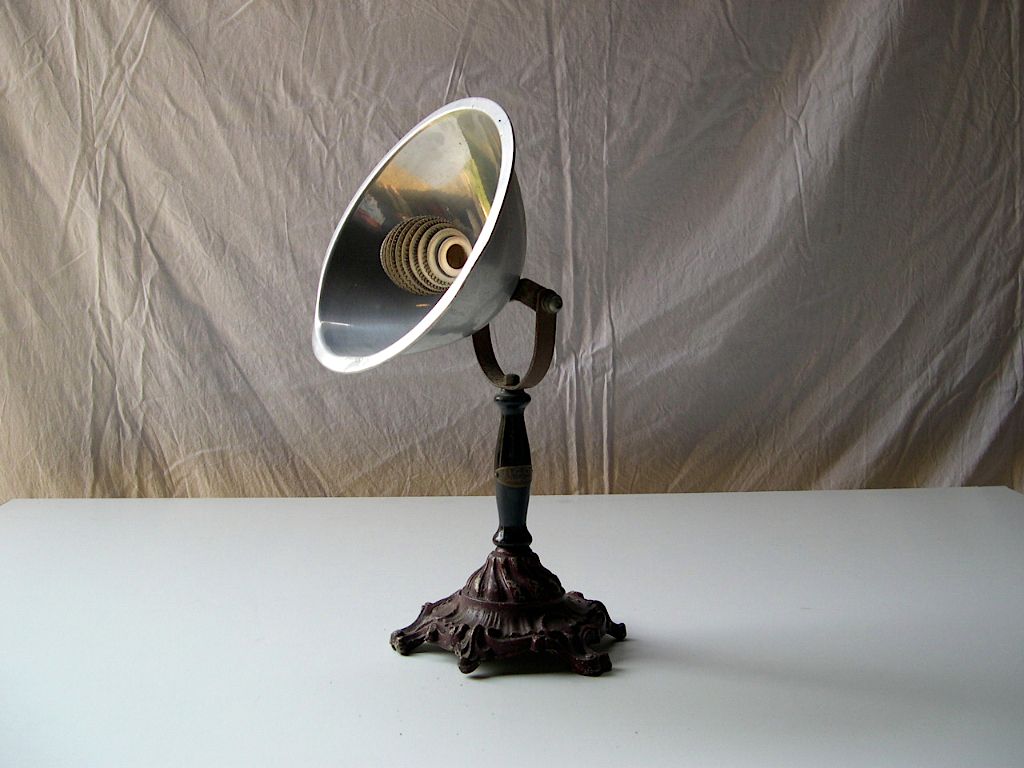 Parabole en aluminium sans protection, résistance spiralée sur support en céramique ovoïde, montant en bois fixé sur pied en fonte ouvragée peinte en marron.