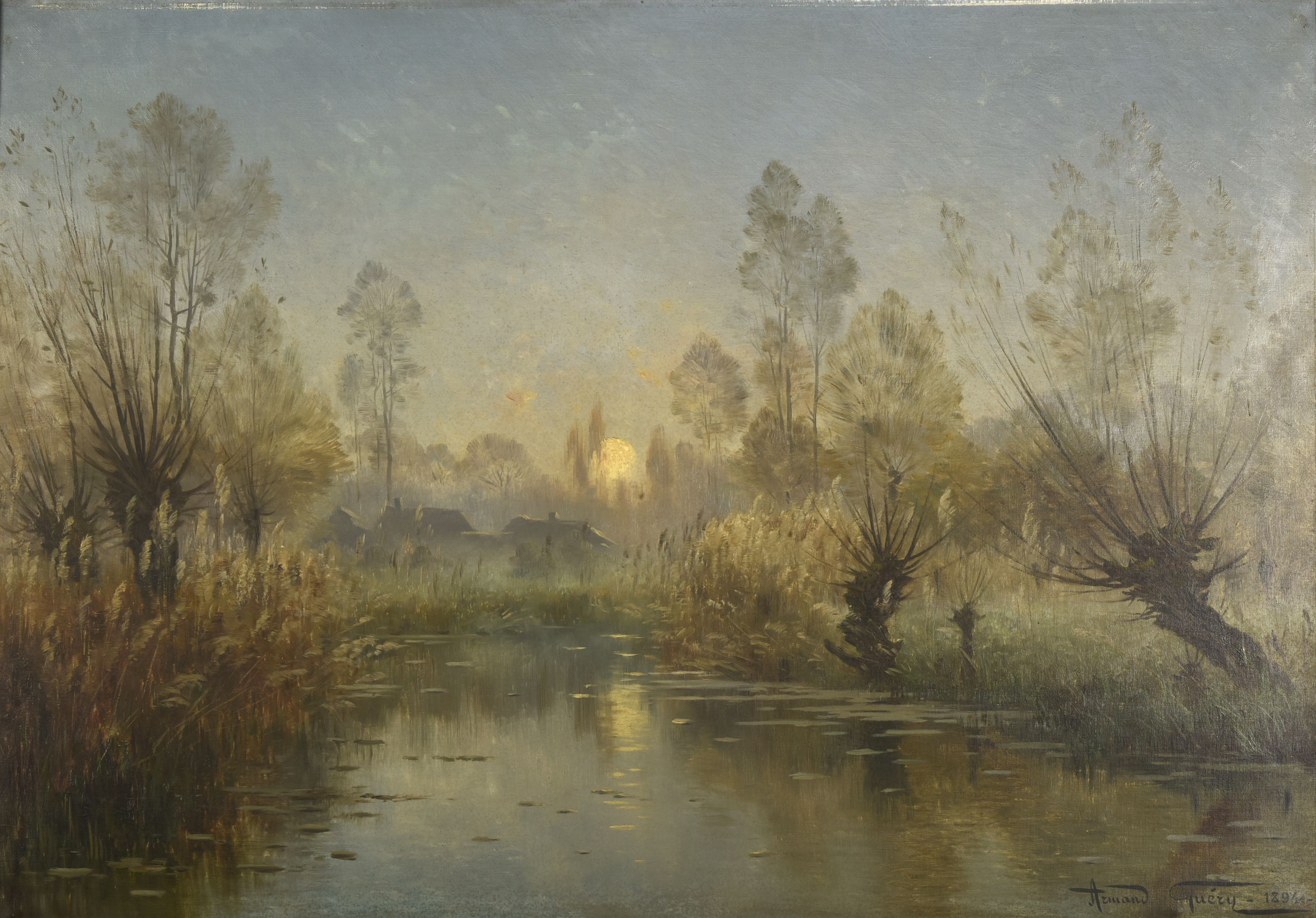 Dans une lumière et des couleurs froides, hivernales, nous suivons les méandres de la Suippe que Guéry va, à cette époque, représenter à de nombreuses reprises et qui passe à Pontgivart, le village où il réside. Des maisons au fond à gauche sont cachées par la brume. Les saules sur la rive dressent leurs branches alors que le soleil qui se couche, et focalise la lumière, se reflète dans les eaux. Guéry, ici, poétise le paysage qu’il entoure et où il aime régulièrement se retrouver en dehors de ses séjours à Paris ou en montagne
