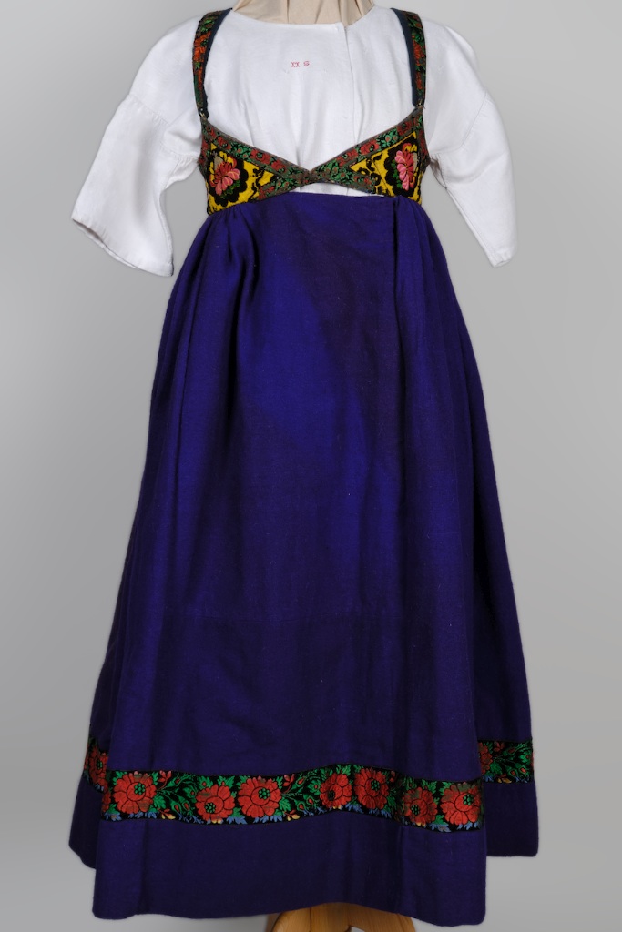 Robe a corselet, bombassin bleu et velours broché