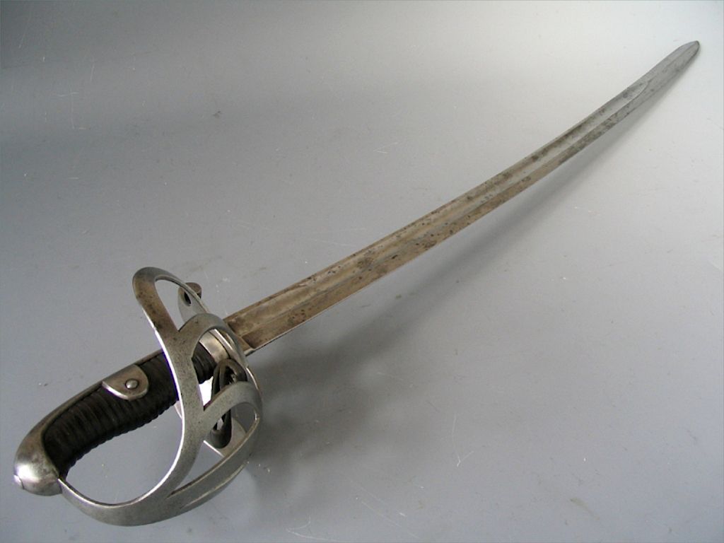 Sabre à monture en panier, la lame à pans creux, à dos plat et flèche légère, est en « langue de carpe », la monture comporte une branche principale d’où se détachent trois branches secondaires sur le côté droit de la lame, sur le côté gauche se développe une simple branche secondaire déterminant ainsi un large plateau de garde, l’ensemble est complété d’un quillon et d’une pièce de pouce en cuir, celle-ci est rattachée au plateau de garde par l’intermédiaire d’une vis fixée dans le plateau, la calotte est à longue queue et à deux oreilles latérales, la fusée en bois est lacée d’une ficelle de chanvre recouverte de cuir, sans filigrane.