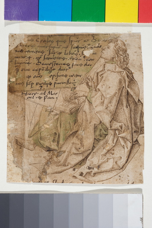 Ce dessin copie une gravure de Martin Schongauer, représentant Saint Jean à Patmos et datée entre 1485 et 1491. Un exemplaire de cette gravure est conservé dans les collections du musée (inv. 93.5.3). L’auteur du dessin n’a reproduit que la figure de saint Jean, laissant de côté tout le contexte environnant (le paysage de l’île de Patmos, l’aigle, la vierge à l’Enfant sur un croissant de lune).