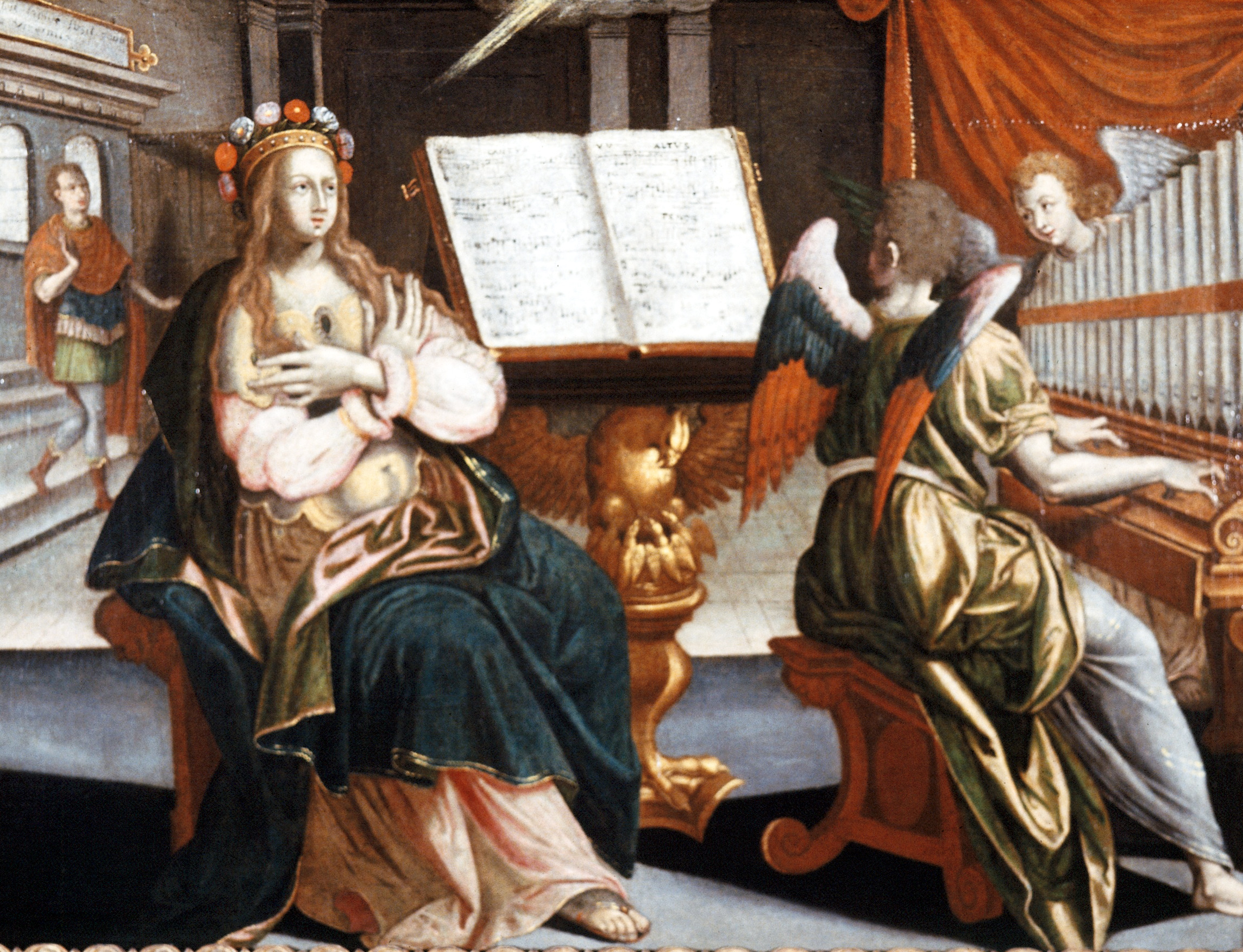 Sainte Cécile les bras croisés sur sa poitrine et portant une couronne surmontée de fleurs est assise à gauche d’un lutrin, sculpté à sa base d’un pélican, portant une partition polyphonique. A droite du lutrin un ange joue d’un positif (petit orgue) sans touches. Un autre ange est derrière l’orgue. Un homme entre à gauche de la composition par une porte surmontée d’une inscription.