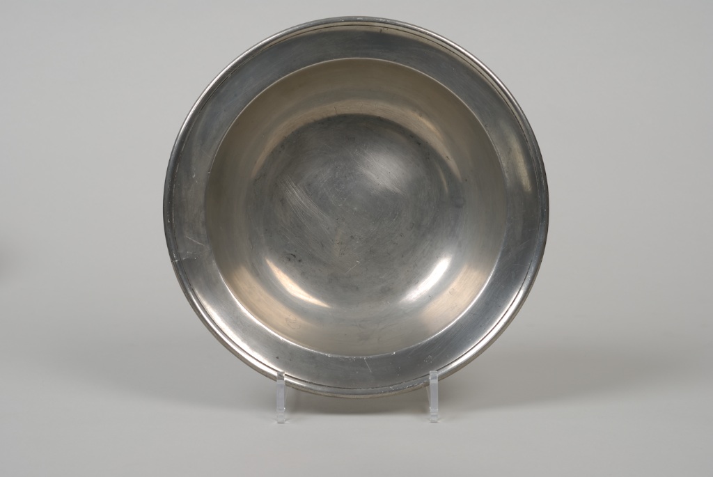 Saladier rond, bord lisse, à l’envers sur le fond, 3 grands poinçons à l’ange de Johann Dietz à Barr, fin du XVIIIème siècle.