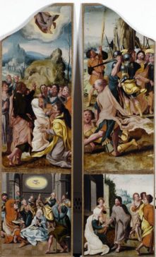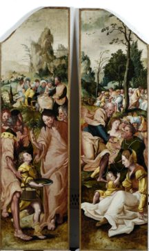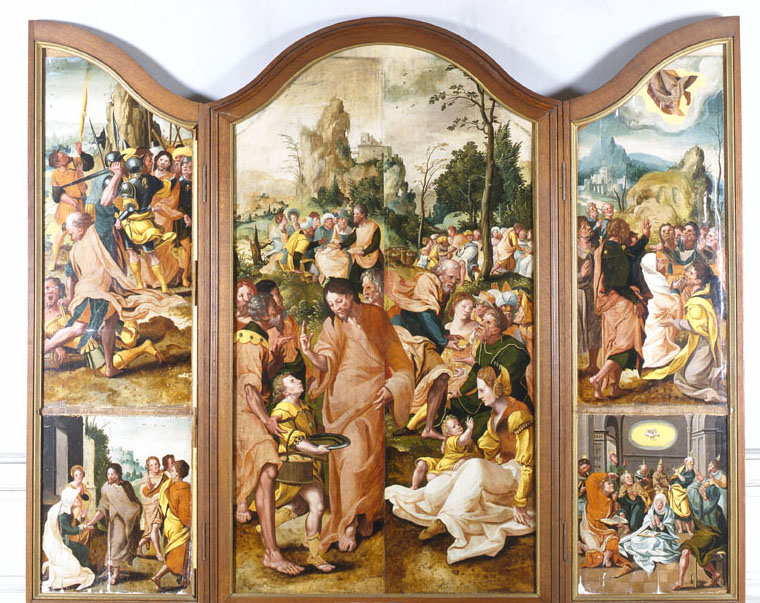 SP : Formaient autrefois les avers et revers des deux panneaux latéraux d’un triptyque. J. S. v. G. : vers 1495-1560. Triptyque représentant les miracles du Christ. Le panneau central est consacré à la multiplication des pains et des poissons. Jésus est au premier plan, au milieu, vêtu d’une tunique rougeâtre, entouré d’une nombreuse assistance. A sa droite, se tiennent un homme et un enfant portant un plat avec un poisson , à sa gauche, une femme est assise sur l’herbe avec, auprès d’elle, un petit enfant. Le tout se détache sur un paysage avec arbres et grand rocher médian, couronne d’un château. Le volet de droite, divisé en deux parties superposées, représente, en bas, la Pentecôte et, en haut, l’Ascension. Le volet de gauche, divisé de même, représente, en bas, la guérison d’une femme âgée et, en haut, l’Arrestation du Christ avec le Baiser de Judas et le miracle de l’oreille.